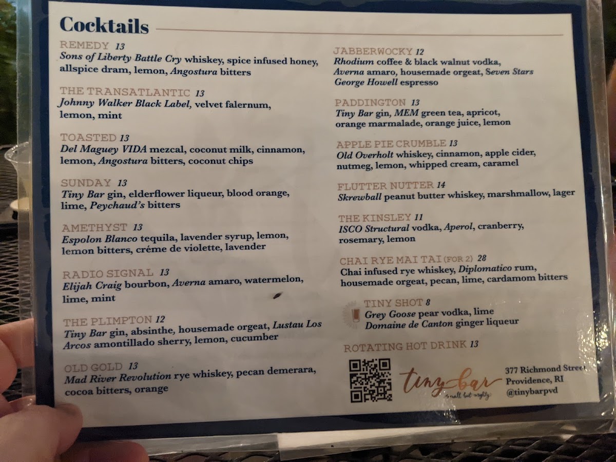 Located at 377 Richmond St in Providence, RI, Tiny Bar embodies a cozy charm with its intimate seating for just a few patrons and ample outdoor options. The atmosphere is both vibrant and welcoming, making it an ideal spot for a night out with friends or a perfect after-work drink.